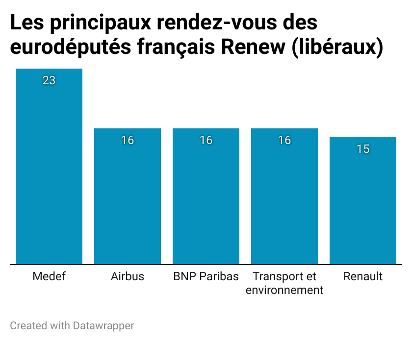Les PfE français, à l’image du groupe, ont moins de rendez-vous déclarés que la moyenne des eurodéputés. C’est la Confédération des petites et moyennes entreprises (CPME) qu’ils auraient rencontré le plus (sept réunions déclarées), devant l’entreprise Primagaz, puis Corteva Agriscience (entreprise de production de pesticides et de semences) TotalEnergies, Eurodom, la Représentation de la Chine auprès de l’UE, la Coordination rurale, l’Union française des semenciers, puis le lobby du porc Inaporc. Le président du groupe et du RN, Jordan Bardella, ne déclare que 13 rendez-vous, surtout avec des lobby agricoles (FNSEA, Jeunes agriculteurs, semenciers), mais aussi avec l’entreprise Renault, avec qui il a échangé sur l’avenir de la filière automobile le 5 novembre dernier.