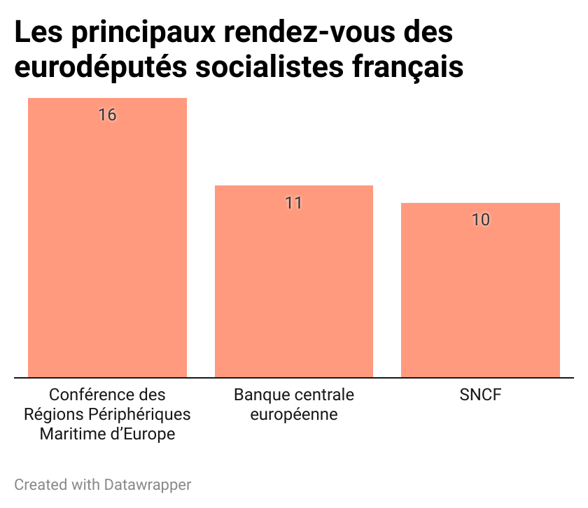 Les réunions des centristes de Renew sont un peu plus variées, avec huit entreprises, neuf organisations industrielles, patronales ou de lobbying privé, mais quand même trois ONG environnementales (European Environmental Bureau, Transport et environnement, WWF Europe) dans le top 20. Chez les treize Français de Renew, le Medef, Airbus, Transport et environnement (ONG), Renault, la Société générale, le WWF Europe et TotalEnergies ont obtenu le plus de rendez-vous (déclarés) – de 23 pour le Medef à 13. Le top 20 du groupe socialiste se diversifie encore un peu plus, avec seulement trois entreprises (Apple, ArcelorMittal et Google), cinq organisations patronales ou d’industriels, cinq ONG, trois syndicats, une fondation, une organisation de protection des consommateurs et une de protection animale.