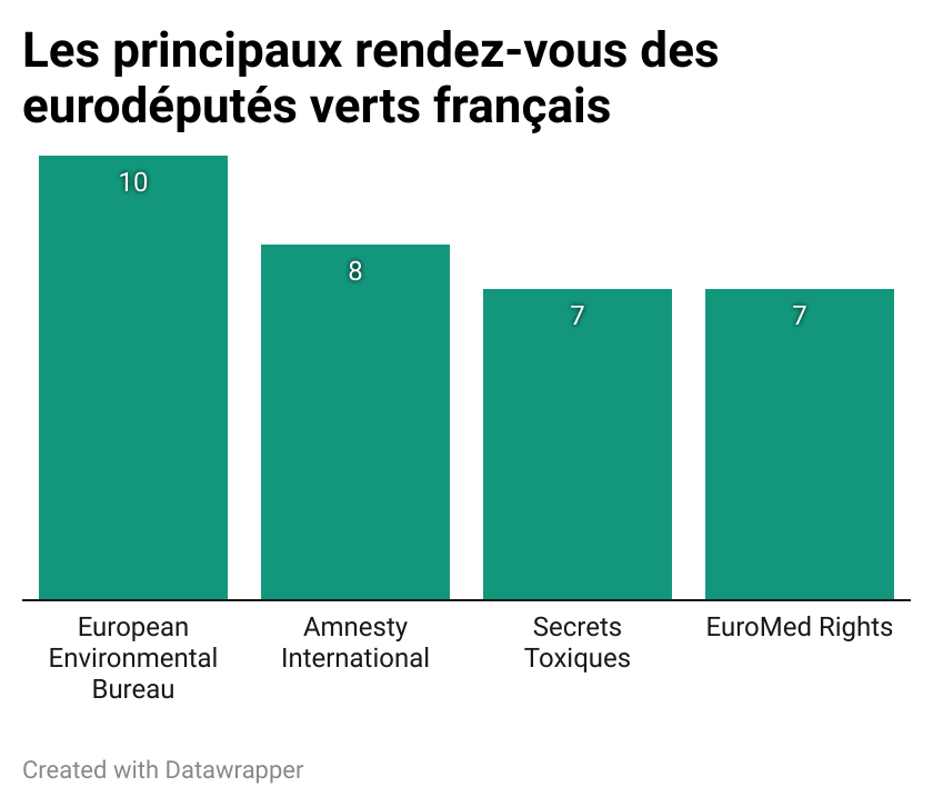 Si l’on se penche sur les acteurs rencontrés par les différents partis politiques, il n’y a pas de grande surprise du côté des partis traditionnels. Dans le top 20 des rendez-vous déclarés par le PPE, on retrouve neuf entreprises, dix groupes d’intérêts industriels et patronaux, et une fondation – la Fondation Konrad Adenauer du parti allemand CDU. Les entreprises qui cumulent le plus de rendez-vous appartiennent au secteur de la Tech (Google, Meta, Apple, Amazon), des énergies fossiles (ExxonMobil, TotalEnergies), de la chimie (Bayer, BASF) et du tabac (Philip Morris). Côté groupes d’intérêts privés, les Chambre de commerce des États-Unis ou de l’Autriche sont bien placés (40 et 35 réunions déclarées), tout comme le lobby du commerce de détail et de gros EuroCommerce (31 réunions déclarées). Pour ce qui est des eurodéputés PPE français (issus des Républicains), la FNSEA arrive en tête des réunions déclarées (sept), suivi par Airbus, l’ambassade d’Egypte, la CGA-CGM et Eurodom (association d’entreprises des DOM-TOM), avec cinq rendez-vous déclarés chacun. Une seule association se hisse dans le top 20 des réunions déclarées par les députés PPE français, Oeuvre d’Orient (aide aux chrétiens d’Orient). À l’échelle du groupe dans son ensemble, aucune ONG ni aucun syndicat n’atteint le haut du classement. Bien sûr, ces députés ont quand même quelques rendez-vous avec ce type d’organisations, mais dans des proportions bien moindre que les acteurs économiques privés.