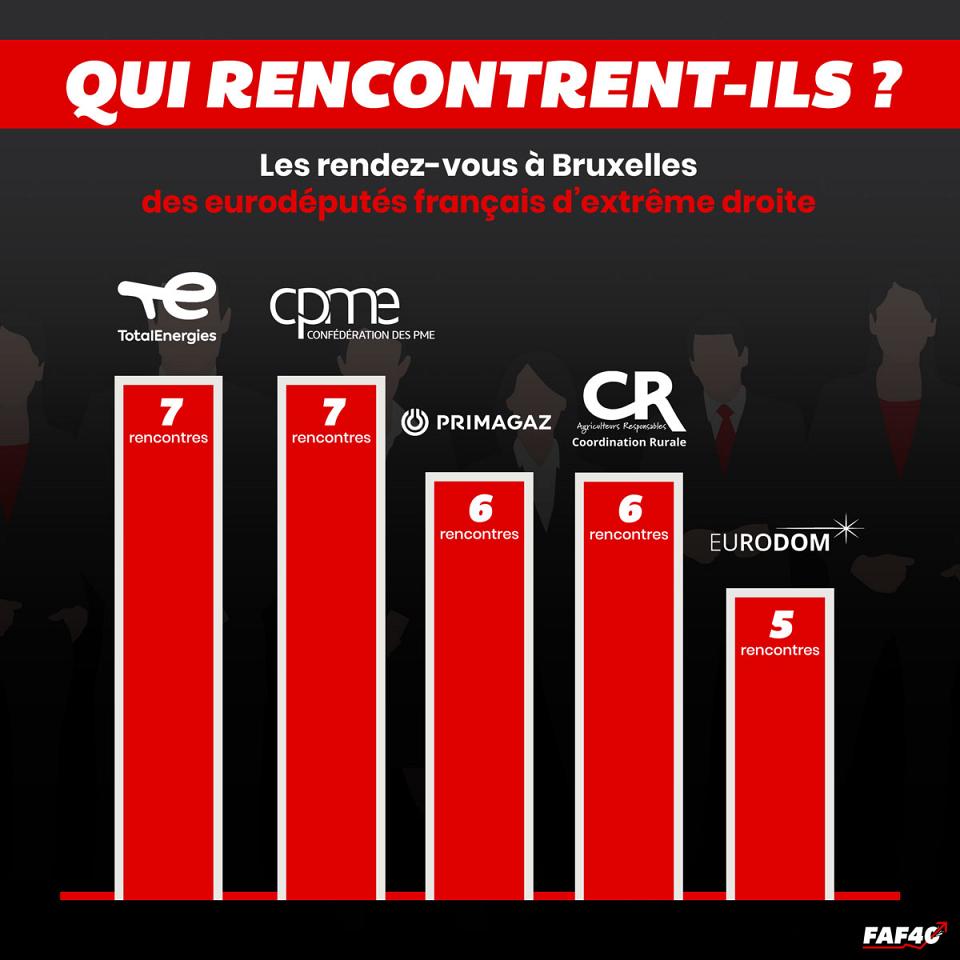 Si on prend les trois groupes d’extrême-droite du Parlement européen ensemble, on retrouve sur le podium des entreprises qu’ils déclarent le plus rencontrer Philip Morris à la première place (29 rendez-vous), devant le lobby des producteurs de carburant FuelsEurope (27) et l’entreprise de gestion de l’eau italienne Acea (25). Chez les français, TotalEnergies et la CPME arrivent en tête avec sept rendez-vous chacun, devant la Coordination rurale, Primagaz, Eurodom, Corteva Agriscience, la représentation de la Chine auprès de l’UE, l’Union française des semenciers, le lobby du porc Inaporc et la multinationale américaine Meta. L’échantillon est limité par le peu de réunions déclarées, mais il indique que les eurodéputés venus de RN et de Reconquête parlent majoritairement avec des représentants d’entreprises et d’intérêts industriels, notamment celles de secteurs à risques pour la santé et l’environnement (pétrole, gaz et agro-industrie). Ce qui pourrait expliquer pourquoi, dans l’hémicycle, ils joignent leurs voix à celles du PPE pour revenir sur les normes protégeant les citoyens contre les activités de ces sociétés.